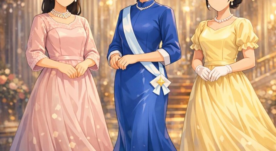色味は可憐ながら、形はあくまで正統派。若々しさと皇族としての落ち着きが両立した装いでした。 -